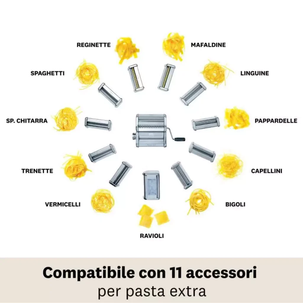 Versatilità: Grazie alla sua flessibilità nella preparazione della pasta, può essere utilizzato per creare una varietà di formati, tra cui lasagne, tagliatelle, tagliolini, fettuccine, spaghetti e linguine.