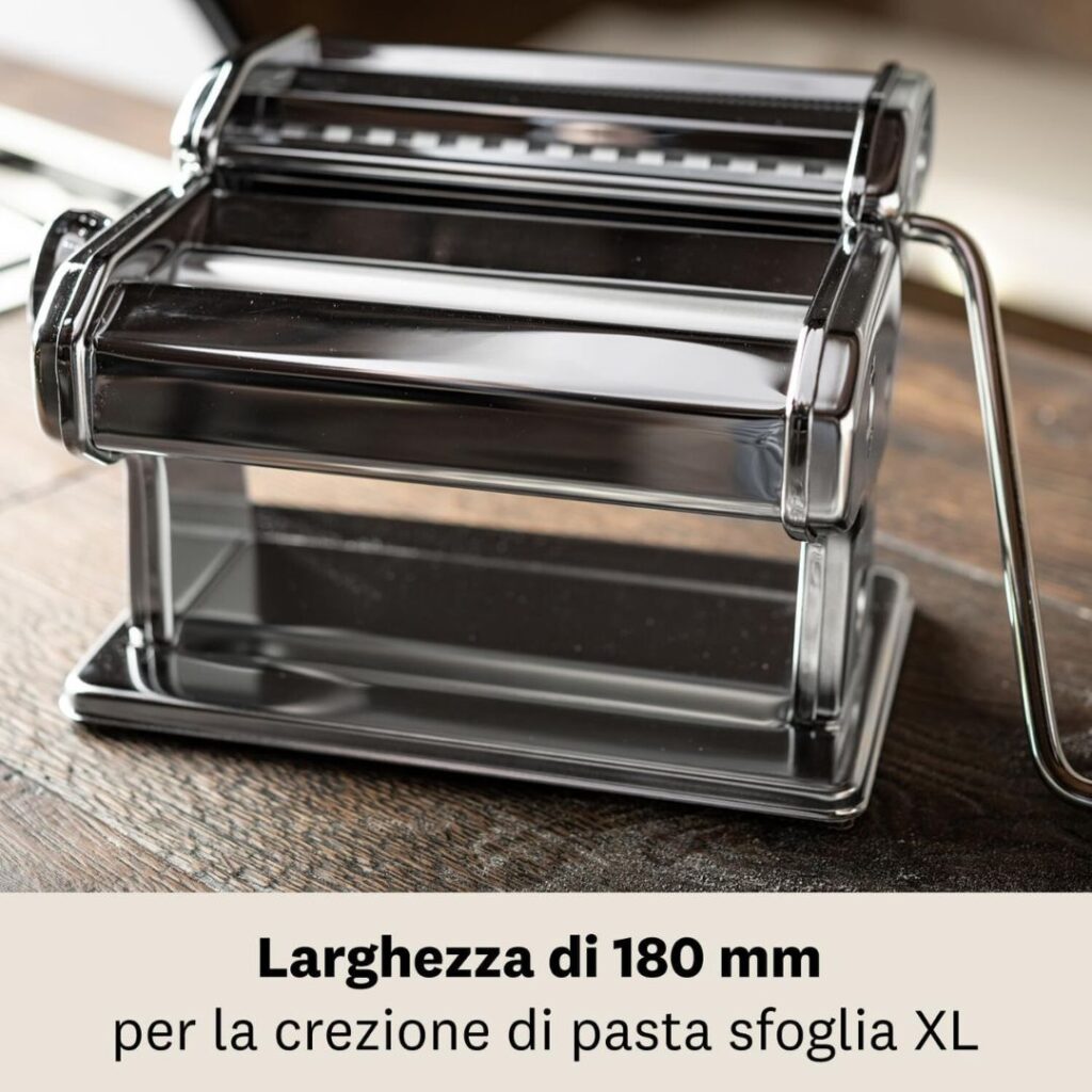 Ampia Larghezza: Con una larghezza di 180 mm, è ideale per la creazione di pasta sfoglia XL, consentendo di stendere fogli estremamente grandi senza la necessità di unire diversi pezzi di pasta.