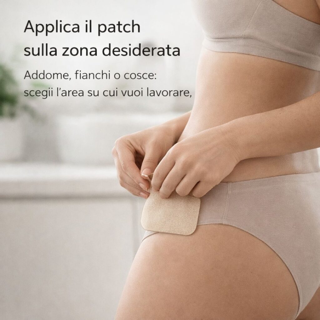 I patch vanno applicati direttamente sulla pelle pulita e asciutta, nelle zone che desideri trattare (addome, fianchi, cosce o glutei).