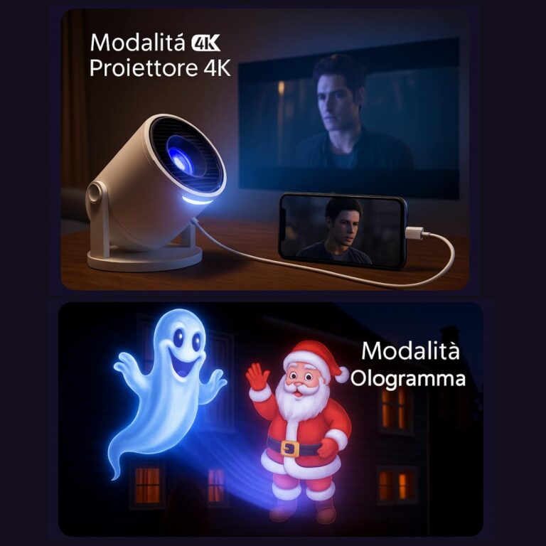 “Proietta ovunque, anche su pareti laterali grazie alla rotazione a 180°. L’intelligenza artificiale regola la luminosità da sola, e la resa dei colori è incredibile. In 5 minuti ho trasformato il salotto in un mini cinema.”